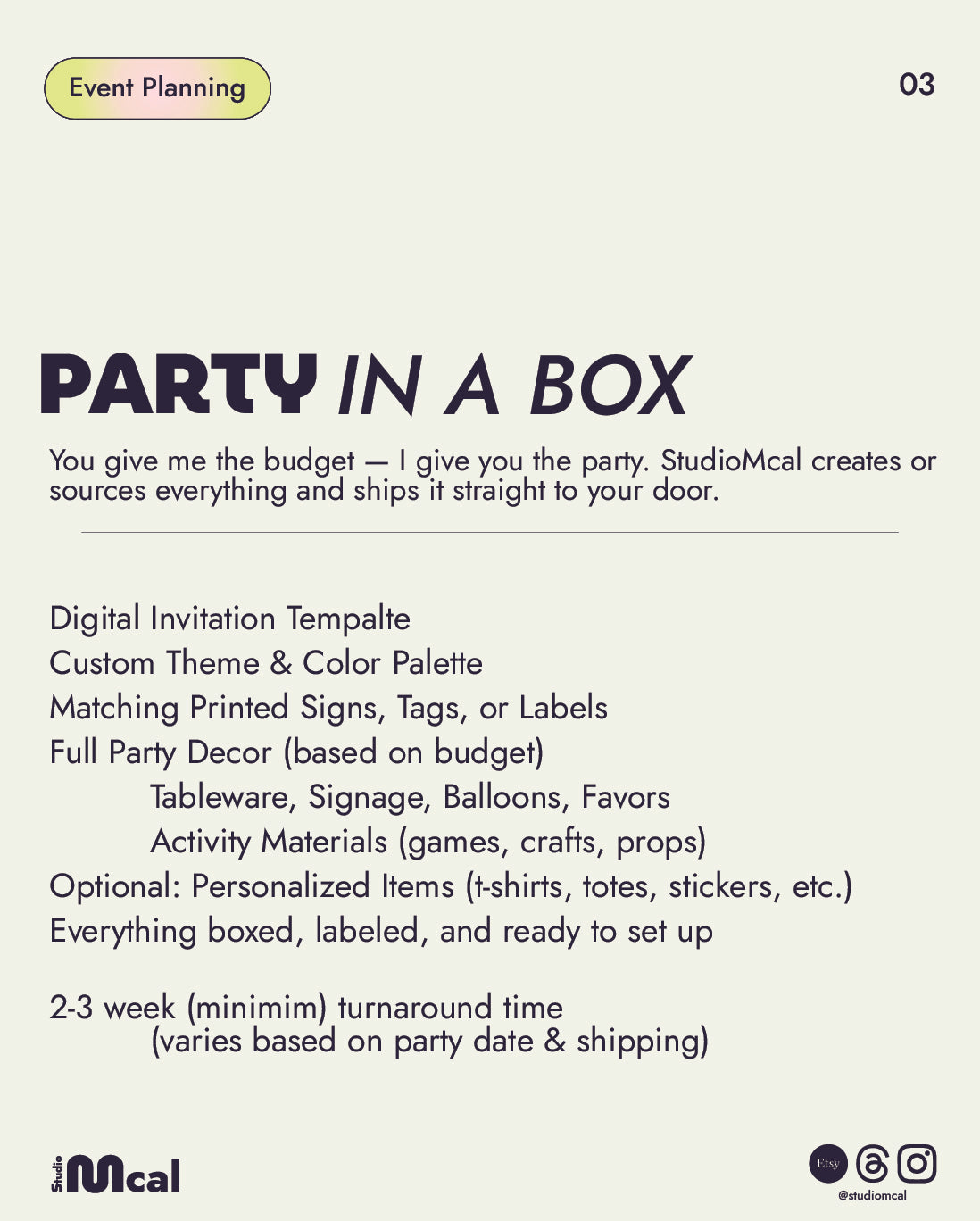 You give me the budget - I give you the party! StudioMcal creates or sources everything and ships it straight to your door!